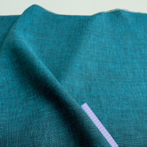 Na indigové osnově melanž 1/1 v paví tyrkysové barevnosti. Proužky 2mm široké, kde se střídají na indigové osnově tyrkysově zelená a tmavě olivová barva, a dohromady tvoří jeden odstín. Z lněné příze, obarvené v Itálii, jsme nechali utkat v Čechách.